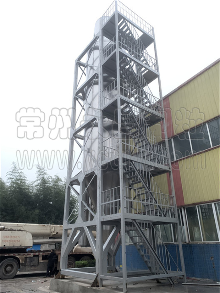 本机组工作过程为料液通过高压均质机高压输入,喷出雾状液滴,然后同热空气并流下降,大部分粉粒由塔底排料口收集,废气及其微小粉末经旋风分离器分离,废气由抽风机排出,粉末由设在旋风分离器下端的授粉筒收集,风机出口还可装备二级除尘装置,回收率在96-98%以上。
