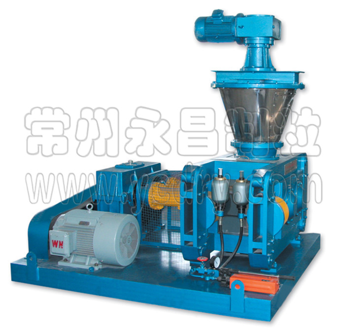 各种干粉物料从设备顶部加入,经脱气、螺旋顶压进入对辊,在对辊的挤压力作用下使物料产生塑性变形而被压缩成片状。片状物料在经过破碎、整粒、筛分等过程,得到颗粒状产品。通过改变辊面开槽方式,可得到片状、条状、扁球状物料。挤压力的大小可根据造粒操作的需要由液压油缸的压力进行调节。