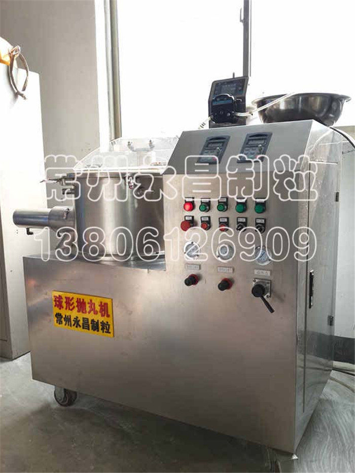 将前道工序做成的湿颗粒投入旋转离心盘内,使湿颗粒受到环隙空气浮力、旋转离心力、自身重力作用,呈环形绳股状运动,从合理方向通过多流体喷枪向运动料层喷入配方液,从而形成圆球度很高的球丸,原理与旋转流化床类似。