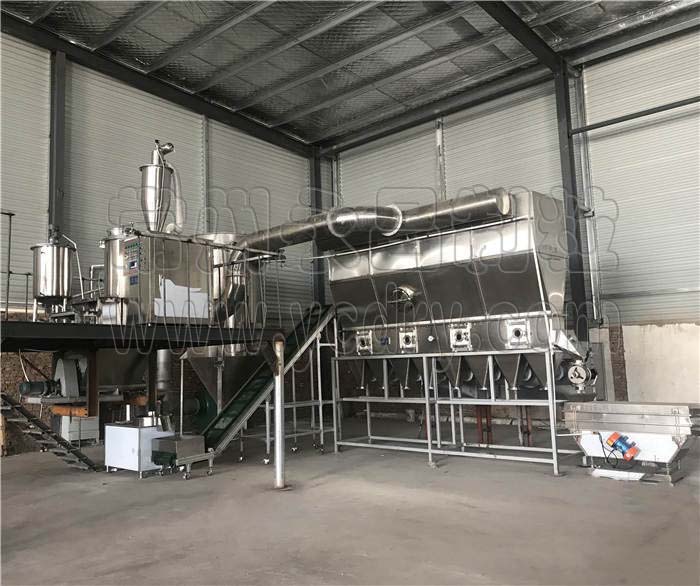 孢子粉收粉干燥机散粒状固体物料由加料器加入流化床干燥器中,过滤后的洁净空气加热后由鼓风机送入流化床底部经分布板与固体物料接触,形成流化态达到气固的热质交换。孢子粉由一级旋风、二级旋风和布袋除尘器收集。物料干燥后由排料口排出,废气由沸腾床顶部排出经旋风除尘器组和布袋除尘器回收固体粉料后排空。蒸气、电、热风炉均可配用(按用户要求配套)。